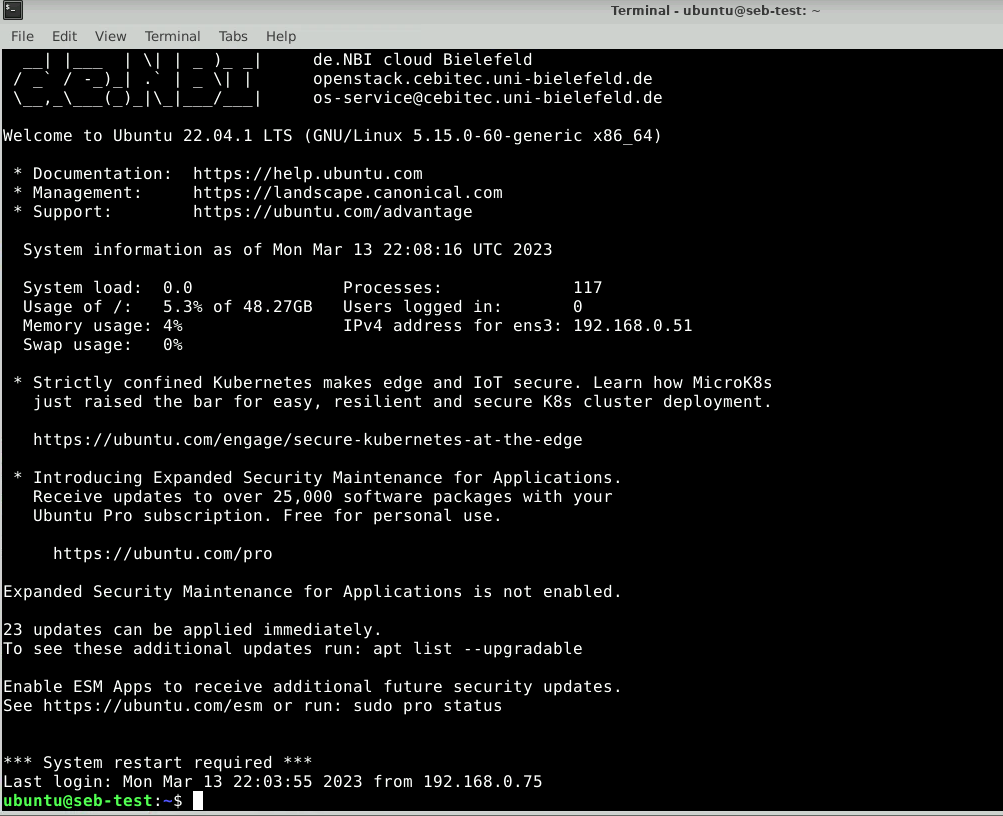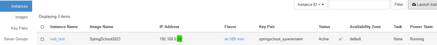 We will now use your newly created SimpleVM as a replacement of any given local compute infrastructure you might be working on in your institute (or just for your laptop). Our goal is to transfer data from your site (that is actually the SimpleVM) to your project in the de.NBI Cloud. For that, we also initialize a second instance in the cloud using the openstack interface.