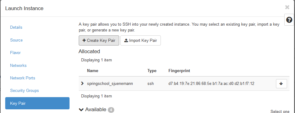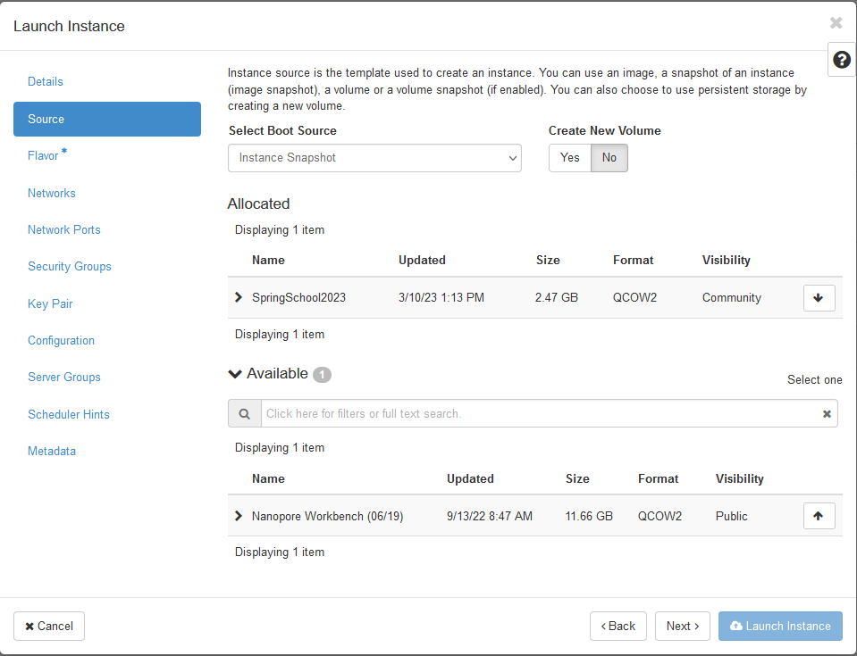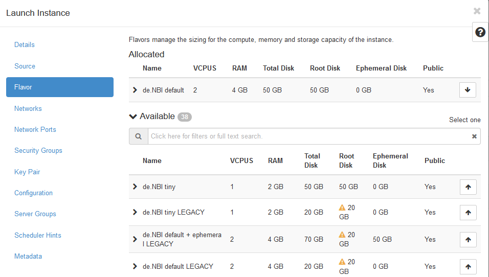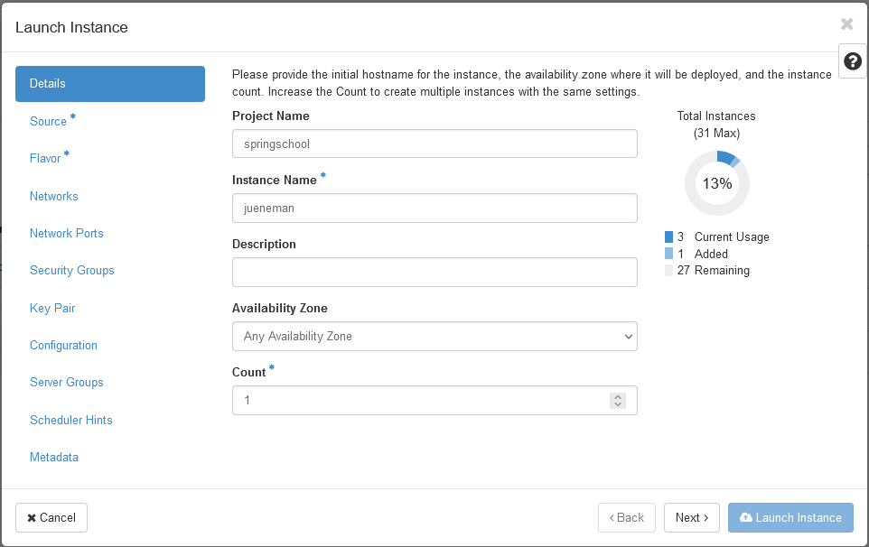 We will now go together through the process of creating a new instance using the more powerful yet also more complex interface as provided by openstack horizon.